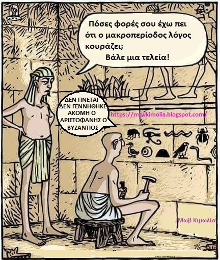 Η αυθεντική γελοιογραφία είναι η ακόλουθη. Η προσθήκη του κειμένου έγινε από τη Μωβ Κιμωλία με εκπαιδευτικό σκοπό και εντάσσεται σε μια ευρύτερη υπό συνεχή κατασκευή ενότητα με θέμα την Ορθή Γραφή.